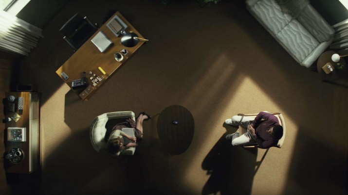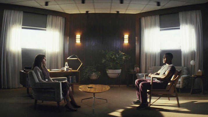 Когда камера фиксируется на месте, а Хэйди готовится начинать, жалюзи по обе стороны от нее визуально создают рамку в кадре, размеры которой имеют соотношение сторон 1:1. Впоследствии оно будет использоваться для разделения сцен прошлого и настоящего. Такой эффект сужения подспудно наталкивает на мысли, что несмотря на то, что Хэйди важно сидит за большим столом, как серьезный доктор, ее компетенция и знания вызывают сомнения. И что самое интересное — данное визуальное решение было принято создателями сериала практически интуитивно.
