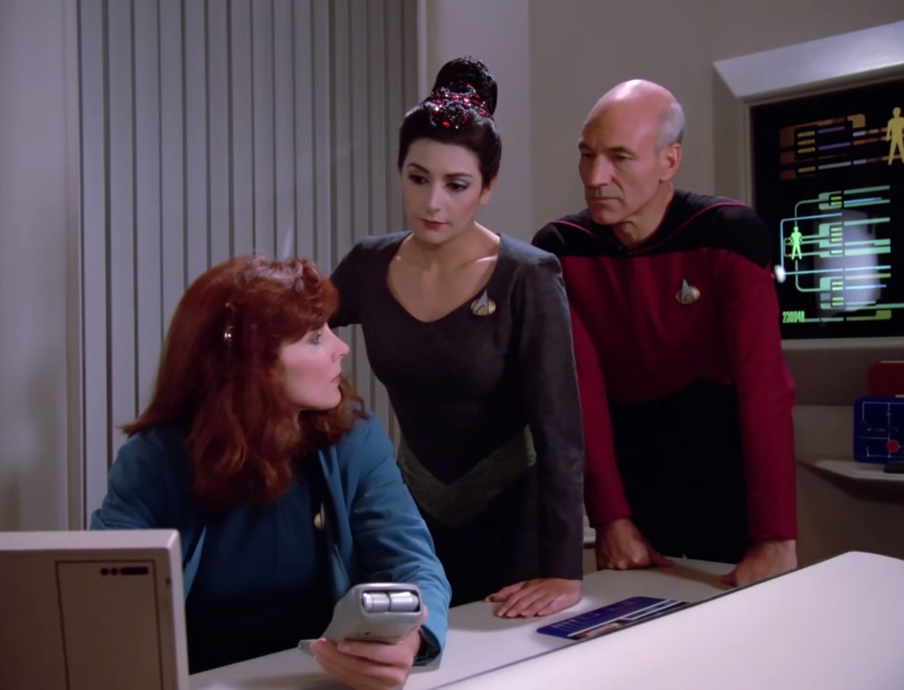 Gates McFadden (Dr. Beverly Crusher), Марина Сиртис (Counselor Deanna Troi), Патрик Стюарт (Capt. Jean-Luc Picard), 1 сезон 2 серия, «Звездный путь: Следующее поколение» (Star Trek: The Next Generation)