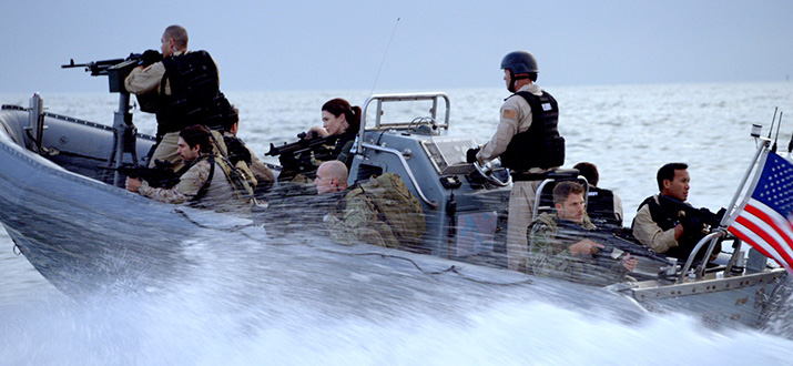 Это свершенно не реально, без разницы чему учат в  ВМС, стрельбу через вертолет не учат нигде, там слишком много переменных, чтобы все учесть. Снаряд летит по определенной дуге, рассчитать эту дугу и встать именно там где надо, это уже за гранью возможного. Да и как уже писал выше это не логично, никто так не стреляет и не стрелял никогда. Тут показана только неспособность стрелять по точке, а только через автоприцел компьютера и то что он при этом попал куда надо, уже фантастика.