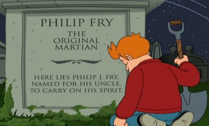 Отношения Фрая с братом Енси такие же непростые. Филип случайно узнает, что брат украл его имя, стал рок-звездой и первым человеком на Марсе. Разочарованный в людях герой выслеживает могилу брата, чтобы откопать амулет — счастливый семилистник. Однако на могильной плите он видит посвящение себе, из которого становится понятно, что Енси назвал Филипом сына, и тот не опозорил имя дяди. Со слезами на глазах Фрай возвращает клевер в могилу — он понимает, что на самом деле семья всегда любила его. В 1999 году Фрай был лузером и покинул то время с относительной легкостью, а в Нью-Нью-Йорке у него больше друзей, интересная работа и выше самооценка. Но там, в 2000 году, все скучают по Филипу, вероятно, даже сильнее, чем он по оставшимся в прошлом близким.